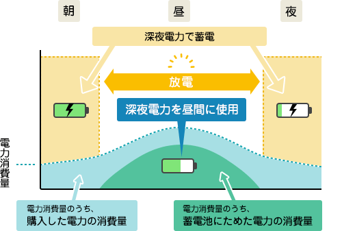 通常は深夜に電気を貯めておき、それを日中・朝晩に使います。深夜電力は朝昼晩の電気より安くなるので、電気代を節約することができます。