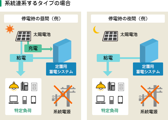 停電の時に、あらかじめ指定した分電盤に自動的に電気を供給します。災害など万が一の時にも、照明やテレビ・冷蔵庫などが使えるのでとても安心です。太陽光発電システムと組み合わせれば、電力の自給自足に近づくことも可能です。