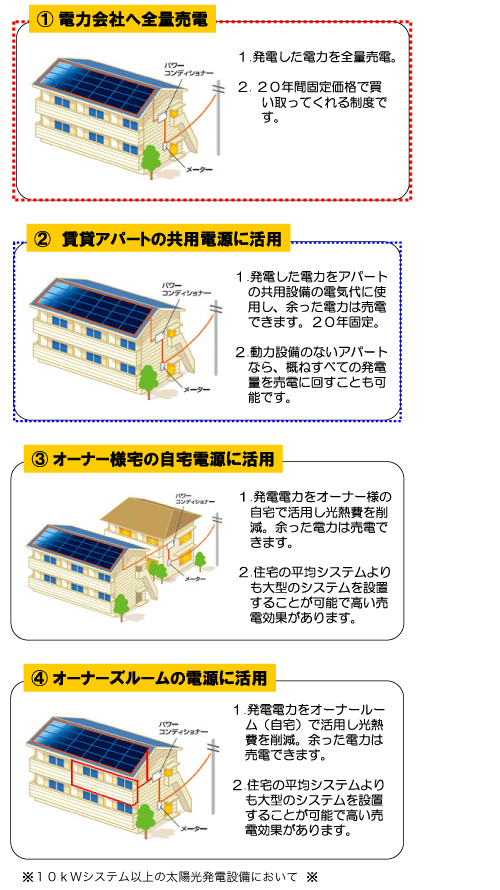 賃貸アパートへの太陽光発電システム導入には、以下の4つのプランがございます。